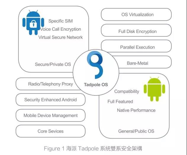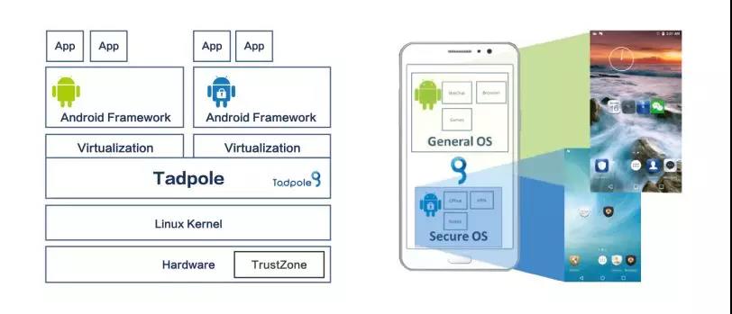 基于系統(tǒng)虛擬化技術(shù),在單一核心下執(zhí)行兩個完整的Android系統(tǒng)。每一個Android系統(tǒng)皆具備完整的執(zhí)行功能并且兼容于第三方軟件。兩個Android系統(tǒng)互不依賴,完全獨(dú)立。當(dāng)Tadpole系統(tǒng)啟動后,可視需求或環(huán)境狀況只啟動任一系統(tǒng),也可以據(jù)實際狀況完全關(guān)閉任一系統(tǒng)。例如在極機(jī)密環(huán)境中,公開日常系統(tǒng) (Public/General OS) 就完全關(guān)閉,而不僅是隱藏在背景執(zhí)行。